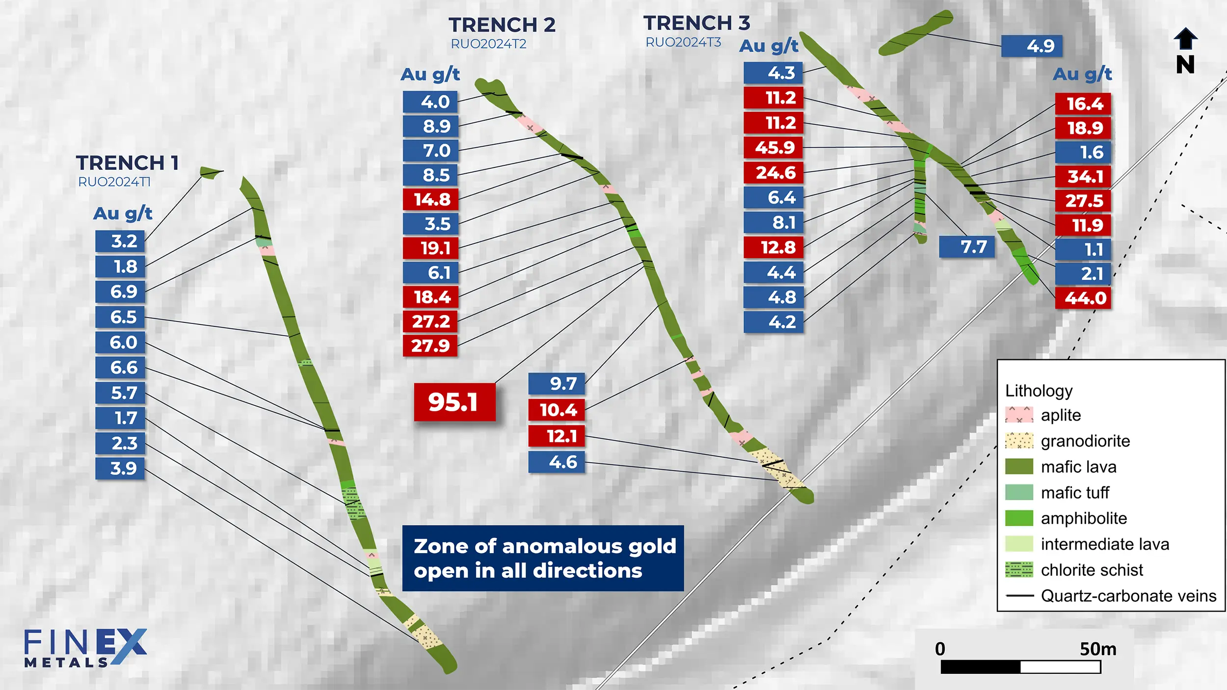 12 Trenches totaling 1,041 m (10 at Ruoppa East, 2 at Outamaa) exposing key structures and lithological contacts